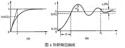 當給靜止的傳感器輸入一個單位階躍信號 時,其輸出信號稱為階躍響應(圖4,a為一階系統;b為二階系統)。