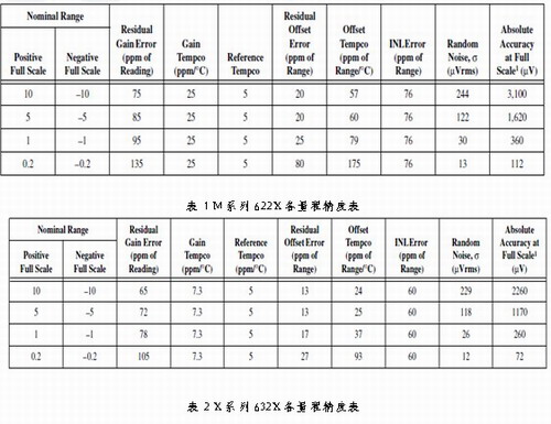 眾所周知,數據采集卡的絕對精度不僅僅等同于分辨率,還和偏置誤差,增益誤差等多個參數有關。X系列使用的ADC分辨率仍然為16位,但各量程的精度和M系列同樣分辨率的產品相比卻有大幅提升,使得測試可以更加精確。下面表1和表2給出了M系列和X系列中同級別板卡的精度對比。