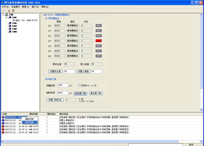 而在窗口的下側列表中,將列舉各種操作信息,包括操作時間,模塊類型, 模塊地址,以及操作失敗,成功以 及模塊狀態等信息(如圖 5 所示)。本列表采取手動清除,如果您想清除列表,請右擊列表,在彈出的菜單項上選 擇“清空列表”。如果您想保存信息,選擇菜單項“保存列表”即可。
