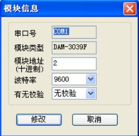 如果您需要改變模塊的信息,您可以在左側的樹型視圖中雙擊您要修改的模塊,將彈出(圖 6)所示的對話框。在 對話框中,包含了當前模塊所在的串口,模塊的類型、地址、波特率,以及有無校驗。在修改完信息后,點擊修改 便可完成修改操作。