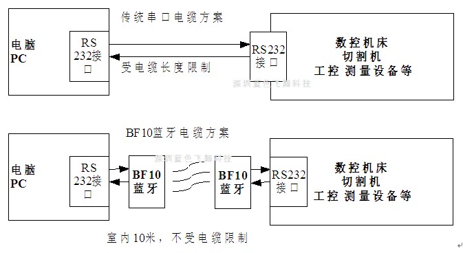 藍牙技術作為一種穩定可靠的2.4G無線射頻技術,,在短距離的數據傳輸方面有著廣泛的應用。在工控、數控自動化、切割機等設備上大多用串口數據傳輸。將PC機電腦軟件通過串口線與設備進行通信數據交換,是一個全雙工的數據傳輸。串口線采用DB9接口,RS232協議,一般情況在1米長度。 由于串口電纜有著長度限制以及在布線上受到一些約束,采用深圳藍色飛舞科技的藍牙模塊BF10(藍牙串口線)則能有著串口線可靠,雙工,數據 不丟包 ,同時能在室內10m通信距離,不受位置,布線等的影響,成為了新型數控機床等設備的首選配件。