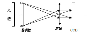 光學液面位移識別部分主要由透明管,光源,透鏡,以及CCD組成 。透明管中的液體為不透明狀,由若干個LED組成的線光源發出的均勻光將透明管的背景照亮,由于光在不同形狀介質中的折射率不同,使得通過透鏡后玻璃管的像在CCD的中間部分形成一條暗帶,上下邊緣部分的透射光相對較強,形成亮帶,中間暗帶的寬度為玻璃管內液柱在CCD上所成的像,通過像的大小來獲取液面的高低,從而達到識別液位的目的。