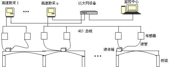 光電液位撓度監測系統示意圖如圖1 所示,液體箱位于橋墩處,每一個液體箱通過若干液體管道可連接若干個撓度傳感器。傳感器的分布根據用戶需要測量的部位情況而定。多個傳感器通過RS-485總線串聯起來連接到高速數據采集設備(以下簡稱高速數采)。一個高速數采可以連接多個這樣的485總線網絡 [1]。當然也可擁有多個高速數采(如果需測的點數多)。多個高速數采可連接到一個以太網設備上,由以太網設備通過光纖等外部線路將數據傳送監控中心進行顯示和分析。