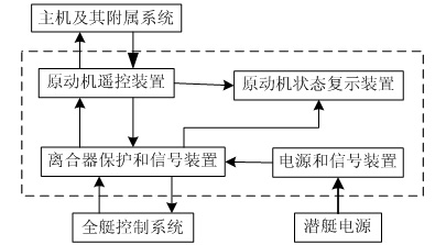 潛艇主機遙控系統(tǒng)由原動機遙控裝置、離合器保護和信號裝置、電源和信號裝置、原動機狀態(tài)復示裝置組成,各部分的連接關(guān)系及與潛艇上其它設備的連接關(guān)系如圖1所示。虛線部分為潛艇主機遙控系統(tǒng)。