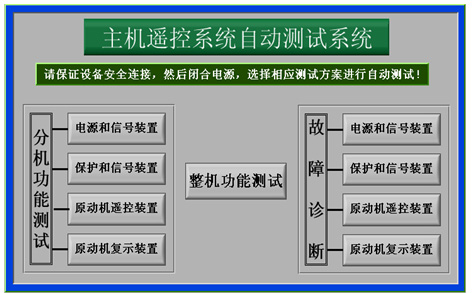 1) 測試系統(tǒng)本身的自檢自校能力。 2) 程序化自動測試和人工輔助測試功能。 3) 能提供被測設備及其部件正常工作和故障診斷所需的激勵信號、模擬負載等環(huán)境條件。 4) 能對主機遙控系統(tǒng)進行功能檢測和性能測試,測試結(jié)果應能直觀地顯示。 5) 具有信號處理、故障分析、故障定位能力,故障點定位要盡可能具體、準確。