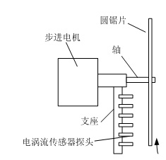 據此,設計檢測系統如圖2所示。在一支座上以一定的間隔固定安裝多個電渦流傳感器探頭,探頭端部平齊。為了防止鐵質支座對電渦流傳感器造成干擾,探頭前端部應突出于支座一定的距離。鋸片安裝上以后,標記一條起始線,然后由步進電機帶動其旋轉,根據步進電機的運動來取得角度α值,R值由電渦流傳感器探頭的安裝位置確定,鋸片平面的變形 則由電渦流傳感器探頭測得該點距探頭端部的距離與探頭端部距基準平面的距離之差獲得。鋸片旋轉一周,則完成單面的檢測。