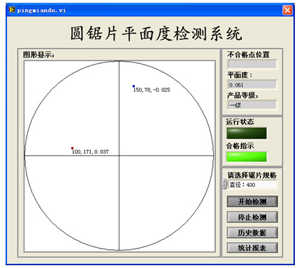 圓鋸片平面度檢測系統的前面板見圖5,包括顯示部分和控制部分。顯示部分以數值形式顯示鋸片平面度值、不合格點位置 (如果存在的話);以文字的形式顯示產品等級;以圖形的形式顯示被檢測鋸片上最“凸”的點和最“凹”的點,并以不同的顏色區分;以LED顯示運行狀態及合格與否。控制部分可以選擇待檢測鋸片規格,并執行檢測、歷史數據回放、報表生成、停止等功能。