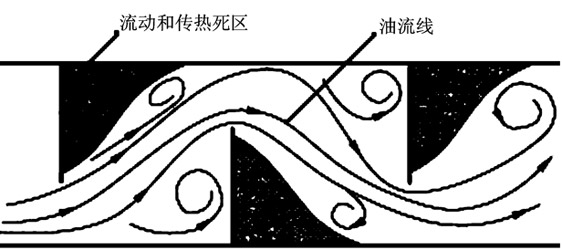 傳統的管殼式冷油器采用弓形折流板支撐管束,油流體在殼程呈“Z”字形流動,在轉折區及進出口兩端渦流的滯留區均會形成流動和傳熱的死區(見圖1),減少了有效傳熱面積,并在死區內形成傳熱垢層,大大降低了傳熱效率。另外,弓形折流板也使油流體垂直沖擊殼體壁面,造成較大的沿程壓降。因此,這種結構的冷油器總傳熱系數K值一直停滯在較低狀態。