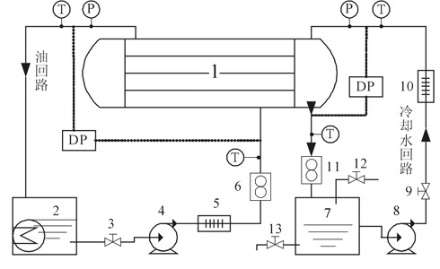 1-冷油器; 2-電熱油罐; 3,9-閥門; 4-油泵; 5,10-快速加熱器 6,11-流量計; 7-冷水箱; 8-冷水泵; 12-補水閥; 13-排污閥 T-熱電偶; P-壓力計; DP-差壓計