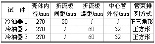 為便于比較,冷油器采用浮頭管板式結構,實驗時只需更換不同的傳熱管束和管間支撐物就可以構成不同內部結構的換熱器。本次實驗元件包括:弓型折流板光管冷油器(簡稱冷油器1),連續螺旋折流板光管冷油器(簡稱冷油器2),連續螺旋折流板齒形翅片管冷油器(簡稱冷油器3)。本冷油器制造后,殼程、管程均以0.8MPa壓力做水壓試驗,各種冷油器的幾何參數及布置形式見表2。
