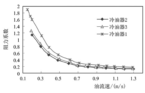 油流速為0.15~1.3m/s時,油冷器3的殼程阻力系數為0.11~1.52。相同流速下,比相同管間支撐物的油冷器2高5%~15%,這是由于三維齒形翅片管增大了油的流動阻力。然而,要比弓形折流板油冷器1低25%~45%,這是由于連續螺旋折流板使得油流體呈縱向流動,可有效減小流動阻力,且流動阻力減小率大于齒形翅片管引起的流動阻力增長率。