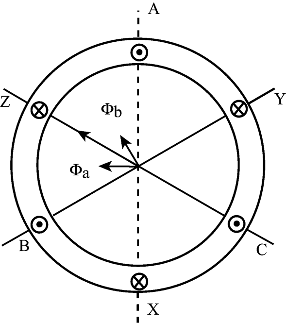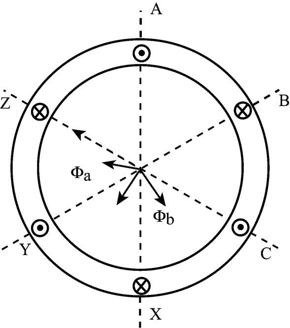 對于Δ連接的電動機,當外部端子確定以后,其內部的連接如圖3所示,其測量原理如下:如果三相繞組連接正確,當在其中的兩相之間,例如AB之間施加一個電壓時,其產生電場的分布情況見圖4,從圖中可以看出Φb,Φc的大小是相同的,因此測量出的電壓Uac(=Uc)和Ubc(=Ub)也基本是相等的。但是當其中的一相,如B相接反了時,情況就發生了變化,不考慮A相繞組磁場對B、C兩相繞組影響時的磁場分布如圖5所示,由于B相繞組和C相繞組中流過的是同一個電流,所以Φc1,Φb1的大小是相同的,但從圖中明顯可以看出Φa對B相繞組起去磁作用,而對C相繞組起助磁作用,從而使最終的B相磁通Φb小于C相的磁通Φc,進而導致Ub