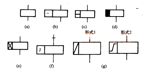 (a)繼電器的一般符號(hào);(b)交流繼電器;(c)快速繼電器;(d)緩放繼電器;(e)緩吸繼電器;(f)極化繼電器;(g)剩磁繼電器