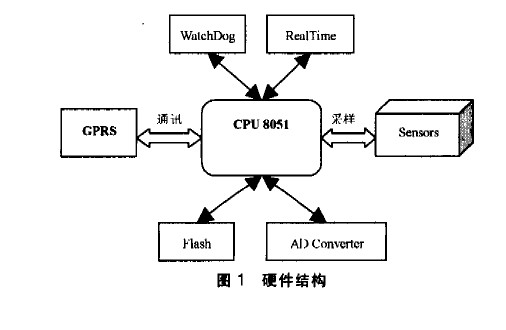 文中研究UDP/IP協議而不是TCP/IP協議,這主要根據本研究背景課題的實際情況而定。UDP相對于TCP的優點在干:簡潔、方便迅速、經濟。缺點在于:傳輸過程中可能出現“丟包”現象但對于本研究所涉及的工程項目則影響不大。具體硬件結構如圖1所示。主要是通過GPRS模塊實現遠程傳輸從傳感器采樣的數據同時能夠通過GPRS網絡實現遠程管理。外圍電路還包括了看門狗、時鐘、閃存、AD轉換器等上位機軟件再通過具體算法實現對數據的分析,是實現農業現代化的必不可少的基礎工作,有很重要的實際意義。