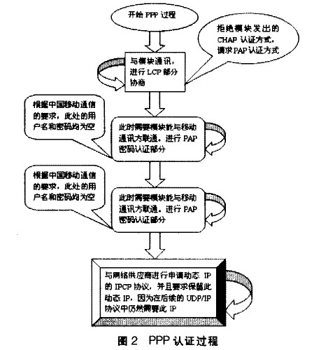 在GPRS模塊上網的過程中,主要是經過PPP協議中的三種協議,分別為LCP(Link Control Protocol)協議,PAP(Pass-word Authentication Protocol)認證協議以及IPCP(Internet Protocol Control Protocol)協議LCP部分主要協商下一步的密碼認證協議,可選擇PAP方式或CHAP方式,我們根據ISP要求選擇PAP方式。PAP部分主要是向ISP發送密碼進行認證。密碼認證通過以后進入IPCP,完成客戶端請求IP及ISP端分發IP的過程。其實現過程圖如圖2所示