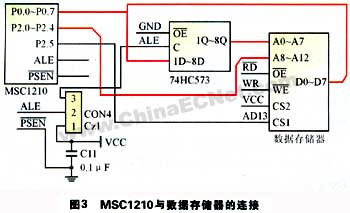 MSC1210主要用于控制GPRS模塊的信息接收和發送,并通過標準RS232串口和外部控制器(比如數據采集端)進行數據通信,同時用軟件實現中斷,以完成數據轉發。 ◇ 單片機模塊 單片機采用美國德州儀器公司最新推出的基于8051內核的MCS1210Y5,該芯片具有很強的數據處理能力,時鐘頻率為33MHz,指令運行速度實際上與運行在99MHz時鐘頻率下的標準8051內核相當,32KB Flash程序存儲器,256B內部RAM和1024B片上SRAM,2KB啟動ROM,支持串行和并行的在系統編程,雙數據指針DPTR0和DPTR1可加快數據塊的移動速度,其主要實現過程如下: (1)通過AT指令初始化GPRS無線模塊,使之附著在GPRS網絡上,以獲得網絡運營商動態分配的GPRS終端IP地址,并與目的終端建立連接。 (2)通過串口0擴展MAX232標準串口和外部控制器(例如數據采集端)連接,外部控制器端接出標準串口,按照約好的協議可很容易利用本設計的控制器進行通信。 (3)復用P1.2和P1.3,也就是串口1分別和GPRS模塊的TXD0和RXD0連接,P1口的其他6個端口分別接到GPRS模塊對應的剩余RS232通信口。通過軟件置位完成對MC35的初始化和控制GPRS模塊的收發數據。 ◇ 擴展數據存儲器 MSC1210的Flash存儲器可全部作為Flash程序存儲器,也可以全部作為數據Flash程序,因為要嵌入實時操作系統和網絡協議,需要一定的空間,因此將其全部用作程序存儲器,而通過74HC573作為地址鎖存器,擴展6264作為外部數據存儲器,8KB的數據存儲空間足夠程序正常運行了,圖3所示是MSC1210與數據存儲器之間的硬件連接圖。