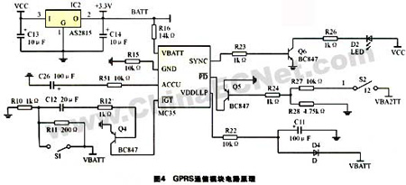 ◇ GPRS無線數傳模塊 GPRS無線模塊作為終端的無線收發模塊,把從單片機發送過來的IP包或基站轉來得的分組數據進行相應的處理后再轉發。 GPRS模塊采用德國Simens公司生產的MC35模塊。MC35模塊主要由射頻天線,內部Flash、SRAM、GSM基帶處理器、匹配電源和一個40腳的ZIF插座組成。GSM基帶處理器是核心部件,其作用相當于一個協議處理器,用來處理外部系統通過串口發送AT指令,射頻天線部分主要實現信號的調制和解調,以及外部射頻信號與內部基帶處理器之間的信號轉換,匹配電源為處理器基射頻部分提供所需的電源。MC35的外圍電路如圖4所示。