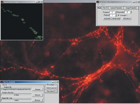 圖1 冷泉港(紐約)實驗室霍華德休斯醫學院的一個研究小組利用Matlab及其圖像捕獲和圖像處理工具箱來研究哺乳動物的大腦如何運作。利用圖像捕獲工具箱,研究人員就可將顯微鏡圖像從攝像機直接流式傳輸到Matlab,并可利用圖像處理工具箱功能來分析一段時間內的圖像。為了一按按鈕就能進行捕獲和分析,研究人員在Matlab中創造了生動的圖形用戶界面。