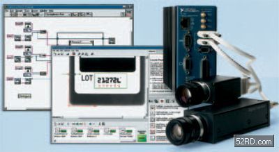 圖3 National Instruments公司的基于Celeron的CVS-1454型小巧視覺系統(Compact Vision System)例證了為工廠環境設計的機器視覺硬件。雖然這一系統(右上)并非一個標準的辦公室PC,但它包含三個FireWire端口從而不需要特殊的攝像機接口硬件。該系統與National Instruments公司的LabView圖形化開發環境配套使用,而這個開發環境能通過交互式圖形化工具快速開發程序,如果有必要,隨后再使用完整的圖形化編程功能調試設備。