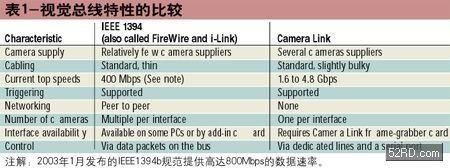 除了FireWire之外,數字輸出攝像機的接口選件還包括RS 422并行接口和Camera Link(表1)。RS 422攝像機接口還沒有完全標準化,所以通常需要攝像機專用接口卡。從用于模擬輸出攝像機的接口卡的意義上來說,這些卡并不是幀接收器,但它們通常同樣可插入主PC的PCI總線。由于有時候需要50多根連線,并行接口被證明并不適用。不過,RS 422數字攝像機仍然受歡迎,并且繼續用得廣泛。
