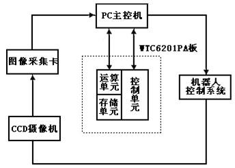 我們選用了WTC6201PA板上的TMS320C6201芯片、FPGA、SBSRAM、SDRAM、雙口RAM、PCI總線、JTAG接口等硬件資源作為視覺圖像處理單元,和PC主控機、圖像采集卡、CCD攝像機和機器人控制系統組成系統,原理框圖如圖3所示。