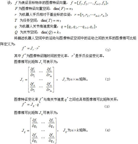 對于圖像反饋機器人視覺伺服系統控制機構,圖像雅可比矩陣是很關鍵的,它描述了機器人空間中的運動與圖像特征空間中的運動之間的關系: