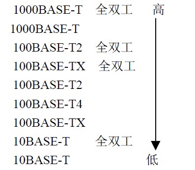 其中最低的級別是 10BASE-T(半雙工、共享以太網),最高為 1000BASE-T 全雙工。這 是一個完整的優先級別方案,但不表示某塊網卡可以處理所有這些技術。實際上,有一些技 術在商業上并沒有實施,但它們都與 IEEE802.3 標準一致。每個端口檢查各自的技術性能并 確定最終的速率(較低的速率)。例如:如果網卡支持 10BASE-T 而交換機端口能力在10BASE-T或 10BASE-TX,那么最終選擇的是 10BASE-T。如果一塊網卡是 10BASE-T,而另 一塊 100BASE-TX,兩者因為不兼容而無法通訊。