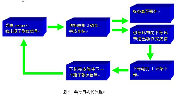 (2)工藝描述如下:當sensor 3感測到瓶時, motor1起動,開始送標;當sensor1感測到mark, motor1停止送標;motor2起動切標。送標,切標過程中瓶子不停止。套標自動化流程如圖2所示。