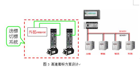 應用臺達ASDA-A2高性能伺服控制器的送標、切標系統,可使套標速度達到600~800瓶/min。方案設計如圖3所示。