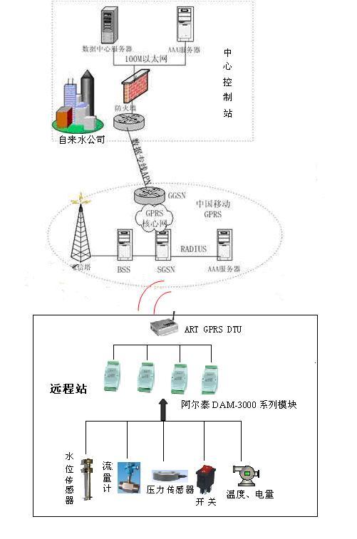 各個(gè)遠(yuǎn)程站采用阿爾泰RTU-6100多功能采集系統(tǒng)對現(xiàn)場設(shè)備進(jìn)行采集和通訊處理。利用各種傳感器來測得水位、壓力、流量、工作機(jī)組的溫度,還可以利用開關(guān)量來控制水泵的啟停等。各種數(shù)據(jù)從RTU-6100傳送到GPRS模塊,,由GPRS模塊把數(shù)據(jù)打成TCP/IP 包,發(fā)送到中心監(jiān)控站。