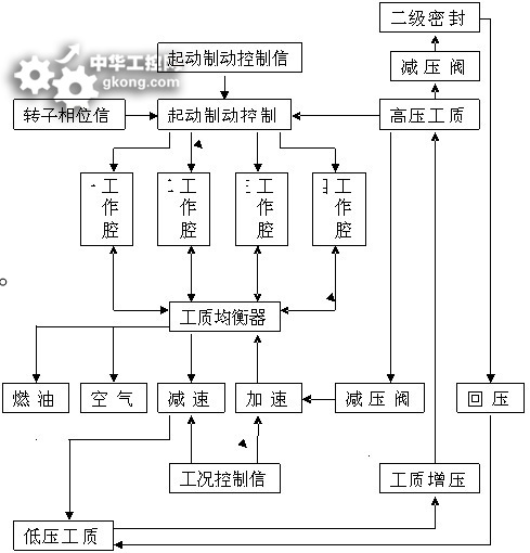 起動制動控制器由4個單向閥和1個接收轉子相位信號和起動制動控制信號、控制4個單向閥開關的裝置組成。4個單向閥的進口端連接高壓工質罐,出口端分別連接4個工作腔。