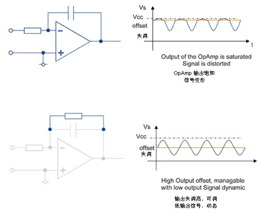 純積分器的主要問題在于,它會對最微弱的寄生失調(例如AmpOp導致的)積分,這樣輸出就總是不穩定,遲早漂移到較高或較低電平處飽和。因此,必須采用靜態增益或有源補償級限制這種漂移: