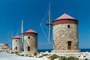 圖1:希臘羅德港內的風車 – 做成轉子旋翼的布已被卷起