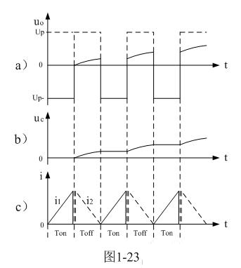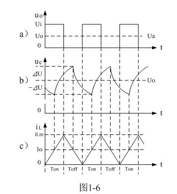 圖1-6是串聯式開關電源工作于臨界連續電流狀態時,串聯式開關電源電路中各點電壓和電流的波形。圖1-6中,Ui為電源的輸入電壓,uo為控制開關K的輸出電壓,Uo為電源濾波輸出電壓,iL為流過儲能濾波電感電流,Io為流過負載的電流。圖1-6-a)是控制開關K輸出電壓的波形;圖1-6-b)是儲能濾波電容C的充、放電曲線圖;圖1-6-c)是流過儲能濾波電感電流iL的波形。當串聯式開關電源工作于臨界連續電流狀態時,控制開關K的占空比D等于0.5,流過負載的電流Io等于流過儲能濾波電感最大電流iLm的二分之一。