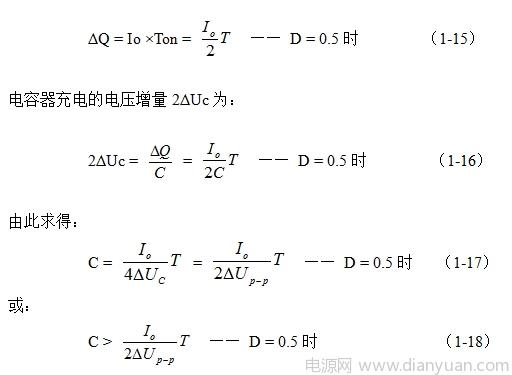 (1-17)和(1-18)式,就是計算串聯式開關電源儲能濾波電容的公式(D = 0.5時)。式中:Io是流過負載的電流,T為控制開關K的工作周期,ΔUP-P為輸出電壓的波紋。電壓波紋ΔUP-P一般都取峰-峰值,所以電壓波紋正好等于電容器充電或放電時的電壓增量,即:ΔUP-P = 2ΔUc 。