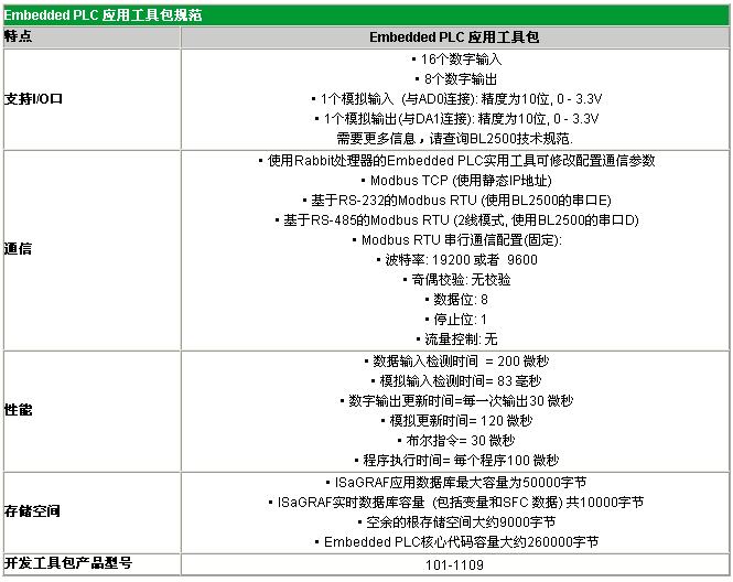 Embedded PLC應用開發包可應用在Rabbit 3000的單板機上,使用PLC(可編程邏輯控制)編程通用的標準軟件環境。自動化控制應用系統設計者現在能夠從Rabbit獲得更多高性價比的硬件解決方案,并且軟件開發與國際標準IEC61131-3兼容。 自動化控制系統像工廠裝配生產線,一般都使用工業編程語言,例如:順序功能圖(SFC),功能塊圖(FBD),梯形圖(LD),結構文本(ST)和指令列表(IL)。Embedded PLC應用開發包支持IEC61131-3標準中包含的所有這些語言,另外還支持其他工業語言流程圖(FC)。開發包還包括ISaGRAF V3.50版本(含32個I/O包),它支持Rabbit硬件平臺的移植。 Embedded PLC應用開發包為您提供所有需要的工具,這樣您可以在Rabbit Semiconductor SBC上使用ISaGRAF PLC編程系統。在該開發包中還包括BL2500,帶flash存儲器,SRAM,數字I/O口,模擬I/O,RS-232/RS-485串口以及10/100baseT以太網口的高級單板機。BL2500單板機為自動化控制工程師提供功能強大,低成本的嵌入式解決方案,適用于像工業裝配控制,訪問控制,HVAC和自動售貨機等高級應用。BL2500僅僅100 x 100毫米的尺寸大小易于安裝在標準100毫米的DIN導軌中。外部連接是通過偏振滾動摩擦鎖相連接器以及線纜提供。 產品特色: · 支持32個I/O 的ISaGRAF V3.50平臺 · 完整具備BL2500特性 · 內嵌BL2500 Embedded PLC內核 · 原裝線,連接器和終端 · 編程連接線和文檔 ISaGRAF V3.50支持以下工業可編程語言: · 順序功能圖(SFC) · 功能塊圖(FBD) · 梯形圖(LD) · 結構化文本(ST) · 指令表(IL) · 流程圖(FC) 應用 · 工業自動化 · 運動控制 · 進程控制 · 分布式控制系統 · 復雜網絡