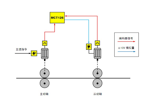 如圖1所示,主電機(jī)的指令由外部輸入,從電機(jī)完全由MCT126按設(shè)定的模式進(jìn)行控制。MCT126通過輸出-10V~+10V模擬電壓到從電機(jī)驅(qū)動(dòng)器,并接收光主從電機(jī)光電編碼器脈沖反饋信號(hào),對(duì)從電機(jī)進(jìn)行全閉環(huán)速度和位置控制,從而實(shí)現(xiàn)主從電機(jī)的絕對(duì)同步。