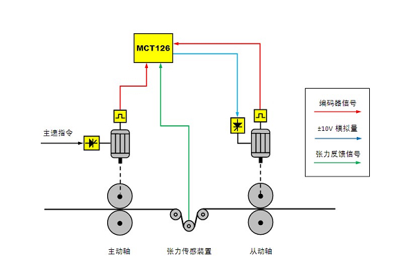 MCT126能方便地接入需要對(duì)張力進(jìn)行控制的同步應(yīng)用場(chǎng)合。MCT126獨(dú)有模擬量相位修整模式,能接收張力反饋信號(hào),自行控制物料的張力,無需增加額外的張力控制器對(duì)同步后的張力進(jìn)行控制。