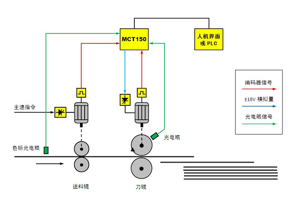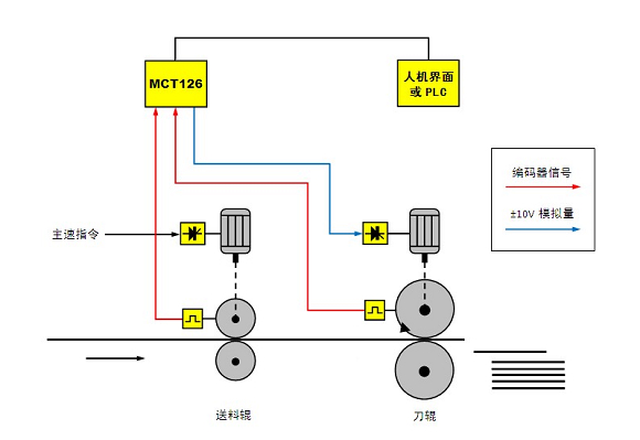 如圖1所示,以送料輥為主軸,由外部控制;以刀輥為從軸,由MCT126進行同步控制。送料輥和刀輥的編碼器信號均接入MCT126。根據需要可用觸摸屏或PLC與MCT126進行通訊操作。