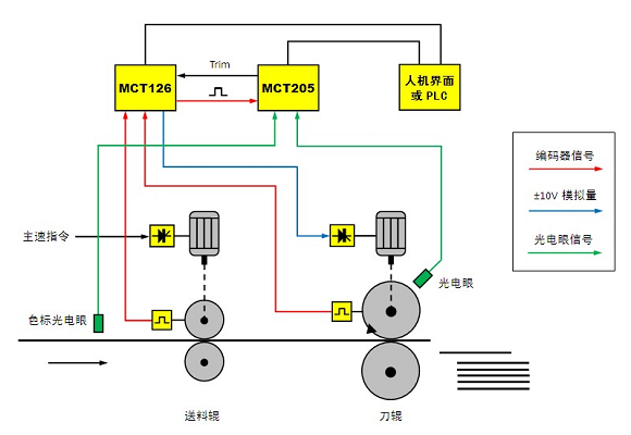 在MCT126定長裁切應用的基礎上,增加MCT205套準控制器與之配合,可以實現高精度對標裁切控制。