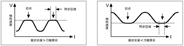 MCT150控制刀輥按計算的曲線運動。刀輥每旋轉一圈分為同步裁切區域和非同步區域,在同步裁切區域,刀輥在裁切前及裁切后指定的角度內和物料速度保持同步,同時進行裁切;在同步裁切區域以外,為非同步區域,刀輥以控制器計算的最小加減速曲線(Sin2曲線)運動。若裁切長度小于刀輥周長,非同步區域的速度會高于同步裁切區域的速度;若裁切長度大于刀輥周長,非同步區域的速度會低于同步裁切區域的速度,有可能降到零。兩種典型的速度曲線如圖4。