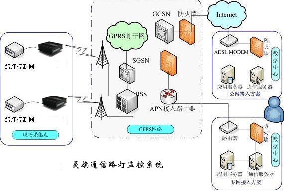 路燈監控系統主要是在線路終端配置了GSM/GPRS傳輸模塊,根據實際情況的不同,GPRS模塊的安裝位置不同。