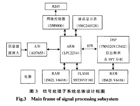 以ARM(選用飛利浦公司的LPC2214)和DSP(Ti公司的TMS320VC5402)為核心,外擴信號調理、A/D采集、網絡控制及液晶顯示模塊.以ARM作為系統控制中心,控制A/D轉換器進行地震加速度已調信號的采集,經DSP的HPI接口將數據存儲到DSP內部RAM 中.完成解調信號的網絡傳輸控制、實時顯示以及TMS320VC5402的HPI引導裝載.而DSP主要進行信號運算,完成解調和FFT頻譜分析.