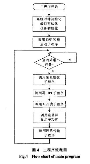 首先編寫好與硬件接口的驅動程序.應用層程序以任務為編程對象.任務具有任務堆棧、優先級等參數,根據任務的執行順序和重要程度可分配不同的優先級;在任務調度過程中可以通過OSTaskSuspend(os PRIO—SELF)、OSTaskResume(task_prio)函數進行任務之間的切換.本系統可分為DSP boot loader、 D采集、讀HPI、寫HPI、網絡傳輸、液晶顯示等6大任務.在主函數中創建任務,設置任務各項參數.主程序流程圖如圖4所示.