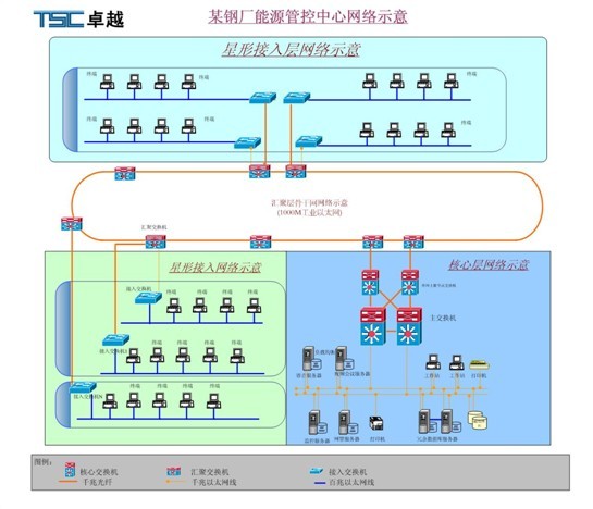 根據該能源管控系統網絡工程現場環境和需求的要求,特選用卓越TSC生產的工業以太網交換機,具體說明如下: 1.工業環形主干網絡 主干鏈路主要由8臺匯聚交換機構建的千兆環網構成。接入層交換機通過星形網絡接入到主干鏈路。 2.終端接入層互聯 在終端接入層互聯上,通過100M光纖或是100Base-TX級聯。在下聯的PLC和終端設備上,通過100M電口連接。 工業以太網交換機在該能源管控系統網絡中的實施優勢 通過對該能源管控系統現有網絡的分析和對穩定性、冗余性、可靠性的保證,在設計中采用工業以太網交換機來滿足此次網絡設備的網絡架構。 工業以太網在該能源管控系統網絡中優勢說明如下: 1.網絡整體架構: 整體骨干網絡按照實際應用的需求構建成為1000M冗余環網。冗余環網組網方式是工業網絡組網的方式,可以實現網絡故障的毫秒級收斂從而為數據的可靠傳輸提供保證。 2.鋼鐵行業要求: 在鋼鐵行業要求上,要求以太網傳輸介質、傳輸設備等,都要求有很強防護等級和抗干擾能力,工業級的以太網設備在惡劣環境的支持、穩定性的保證、設備保質期的保證等等方面都凸顯了自身的優勢。