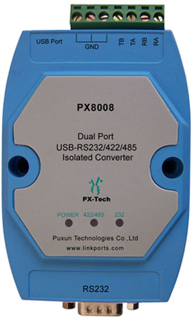 對于很多需要用筆記本電腦做設備調試的工程師來說,當今大部分筆記本沒有配備串口,而USB接口成為筆記本電腦的標配接口。如果工程師用筆記本電腦對現場RS-232或是RS-422/485設備進行調試,成為一個頭疼的問題。通常有用戶會選用市場上低檔的USB到RS-232轉換線纜,但這種低性能的轉換線纜在實際使用中會經常出現數據傳輸不穩定、與系統兼容性差、傳輸大數據禎時容易出錯等問題,這些問題非常容易誤導工程師。更為重要的是,如果需要接現場的RS-422或是RS-485設備,工程師必將再接一塊串口竊電的無源的RS-232轉RS-422/485轉換器,如采用這種應用方式,那么數據傳輸的可靠性和穩定性就可想而知了。此外有干擾嚴重的工業現場由于USB-232口損壞計算機USB口的現象屢見不鮮,相信很多工程師都有過類似的痛苦經歷,但市場上又沒有更好的產品來解決這個問題。 基于對串口通訊產品的長期的專業研發與制造基礎,濟南普訊科技最新推出串口通訊的利器-USB轉雙串口光電隔離轉換器,型號為PX8008,其工業級的設計思路與理念、完備的光電隔離與突波保護措施,使其卓越的性能根本區別于商用水平的普通USB-RS232轉換器。徹底解決使用筆記本電腦的工程師做現場調試的后顧之憂。 型號為PX8008的USB轉雙串口光電隔離轉換器,在正確的安裝完驅動程序后,將在用戶的筆記本電腦中創建2個獨立的串口-比如您的筆記本電腦中有系統默認的COM1,那么PX8008將另外創建2個串口,分別是COM2和COM3。其中創建的虛擬串口COM2是一個全線(包含DCD、RXD、TXD、DTR、GND、DSR、RTS、CTS、RI)DB-9接口的九針RS-232接口,這與臺式計算機的串口完全一樣。PX8008創建的虛擬串口COM3,直接完成了USB到RS-422或是RS-485的光電隔離轉換功能(RS-422與RS485公用一組壓線式接線端子,RS-422與RS-485的選擇通過板載的跳線開關選擇)。那么就意味著用戶選用虛擬串口COM3,就可以直接與RS-422設備相連接,如采用RS-485接線方式,那么PX8008將是一個2端口的RS-485集線器,用戶可以用TA、TB,或是RA、RB任意一組與設備的RS-485端口相連,將節點數提高一倍。 作為2個獨立的虛擬串口COM2與COM3,用戶在一個模塊上,就可以同時實現USB到全線RS-232口和USB到RS-422/485的轉換功能。 主要功能及技術指標: 工業導軌安裝,適用于工業現場; -USB端口轉換為2個獨立的串口;其中RS-232端口為9線制DB-9針式全線串口; -支持同時應用于RS-232與RS-422全雙工模式,或2通道RS-485集線器半雙工通訊模式; -信號光電隔離,電源DC-DC隔離轉換,隔離耐壓達3000V; TI公司專用芯片實現計算機USB接口保護 -內置600W抗雷擊保護器保護RS485口,以及16KV ESD保護RS232 -LED指示電源、信號收、發工作狀態; -USB端口取電,無需外部供電; -數據傳輸速率自動適應,覆蓋0~1MBPS; -通訊距離支持1500米以內(與通訊速率、通訊電纜性能有關); -內置跳線可配置RS-485總線終端電阻; -工業級溫度范圍; -輸入:USB方形插座; -輸出:RS-232為DB-9針式接頭,RS-422/485使用7線壓線接線端子; -尺寸: L*W*H: 115*70*25mm -------------------------------- 濟南普訊科技有限責任公司 銷售部: 李民 電話:0531-846424518 86652206 傳真:0531-86424519 電郵:limin@pxtech.cn 網站 www.pxtech.cn Jinan Puxun Technologies.Co.,Ltd No.5-1 Yangtouyu Street Jinan Shandong Province.P.R.China Sales Manager: Mr.Li Min Tel:+86-531-86424518 86652206 Fax:+86-531-86424519 e-mail: limin@pxtech.cn MSN:puxuntech@hotmail.com Skype:pxtech2 Web:www.linkports.com