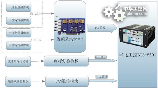 BIS-6591提供兩組PCI插槽,可外接兩個(gè)視頻采集卡。每個(gè)視頻采集卡可接一路全景攝像機(jī)、三組特寫攝像機(jī),南北走向和東西走向各一組,滿足單個(gè)十字路口的監(jiān)控需求。攝像機(jī)的數(shù)據(jù)經(jīng)視頻采集卡通過(guò)PCI插槽實(shí)時(shí)傳到BIS-6591。運(yùn)行在BIS-6591上的智能程序,通過(guò)分析接收來(lái)的紅綠燈檢測(cè)信號(hào)和車輛檢測(cè)串口信號(hào),判斷車輛是否穿紅燈,是否超速,是否逆行行駛。如果車輛違章,則對(duì)違章車輛進(jìn)行實(shí)時(shí)拍照取證。