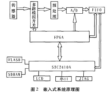 系統硬件主要分為ARM處理器模塊、協處理器FPGA模塊、預處理和A/D模塊、通用外設模塊4個部分,ARM處理器和現場可編程門陣列(FP.GA)共同組成監控系統的核心處理單元。現場勘探檢測時,可利用爆炸的方式作為激發震源,當一次爆炸啟動后,傳感器信號通過模擬開關,先經過前置放大和濾波等預處理,獲取符合A/D轉換芯片要求的信號,經過A/D轉換,進入FIFO,然后由嵌入式微處理器讀取并處理數據,然后將數據存儲到SIM卡或USB存儲設備中。在A/D轉換模塊中,采用多路模擬開關,可完成大數量點的數據采集。FPGA是整個系統的控制中心,控制采集通道的切換,A/D轉換芯片的啟停,轉換后的數據在FIFO中的存放以及向主處理器$3C2410A產生中斷請求讀取FIFO中的數據。如圖2所示。