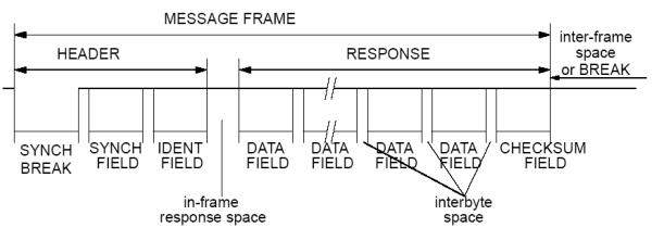 一個報文幀是由一個主機節點發送的報文頭和一個主機或從機節點發送的響應組成。報文幀的報文頭包括一個同步間隔場(SYNCH BREAK FIELD)、一個同步場(SYNCH FIELD)和一個標識符場。報文幀的響應主要包括3到9個字節場組成,其中含有2、4或8個數據場(DATA FIELD)和一個校驗和場(CHECKSUM FIELD)。字節場由字節間空間分隔,報文幀的報文頭和響應是由一個幀內響應空間分隔。最小的字節間空間和幀內響應空間是0,這些空間的最大長度為報文幀的最大長度TFRAME_MAX。如圖1表示: