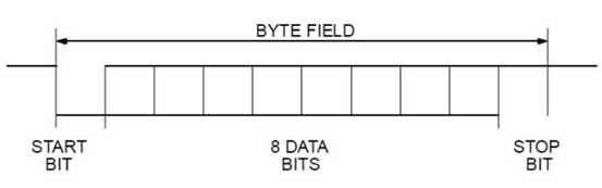 格式見圖2,每一個字節場的長度由10個定時位定時(BIT TIME),起始位(START BIT)是一個“顯性”位,代表著該字節場的開始。接著是8個數據位,首先要發送的是最低位。停止位(STOP BIT)是一個“隱性”位,它代表著字節場的結束。